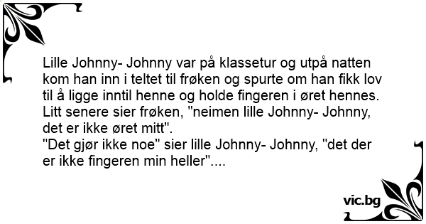 Lille Johnny- Johnny var på klassetur og utpå natten kom han inn i teltet til frøken og spurte om han fikk lov til å ligge inntil henne og holde fingeren i øret hennes.