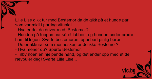 Lille Lise gikk tur med Bestemor da de gikk på et hunde par som var midt i parringsritualet.