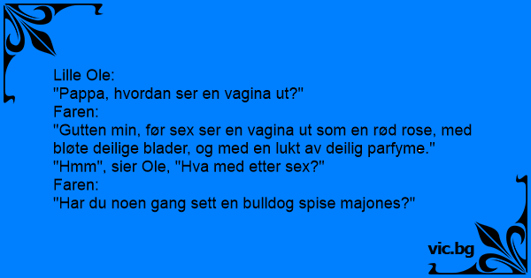 Малкия Иванчо пита баща си: - Тате, как изглежда вагината? - Ами...преди с*екс е, като неразцъфнала роза. - А след? - Хм..виждал ли си някога как булдог яде майонеза?