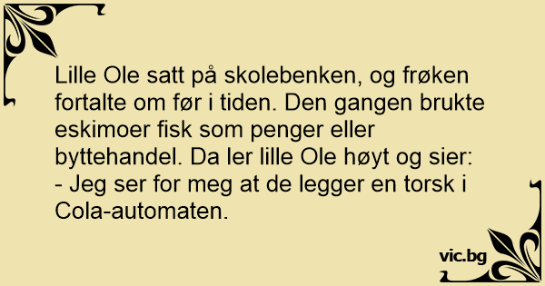 Lille Ole satt på skolebenken, og frøken fortalte om før i tiden. Den gangen brukte eskimoer fisk som penger eller byttehandel. Da ler lille Ole høyt og sier:
