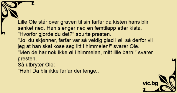 "Jo, du skjønner, farfar var så veldig glad i øl, så derfor vil jeg at han skal kose seg litt i himmelen!" svarer Ole.