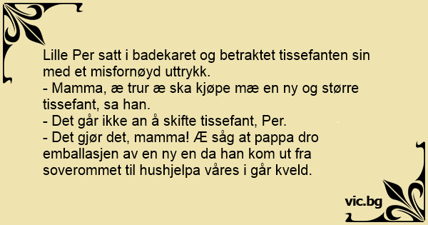- Mamma, æ trur æ ska kjøpe mæ en ny og større tissefant, sa han.