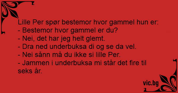 Lille Per spør bestemor hvor gammel hun er:<br />- Bestemor hvor gammel er du?<br />- Nei, det har jeg helt glemt.<br />- Dra ned underbuksa di og se da vel.<br />- Nei sånn må du ikke si lille Per.<br />- Jammen i underbuksa mi står det fire til sекs år.