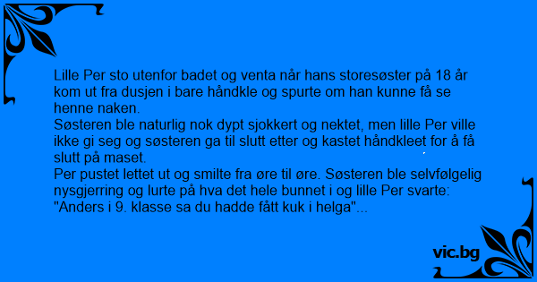 Lille Per sto utenfor badet og venta når hans storesøster på 18 år kom ut fra dusjen i bare håndkle og spurte om han kunne få se henne naken.