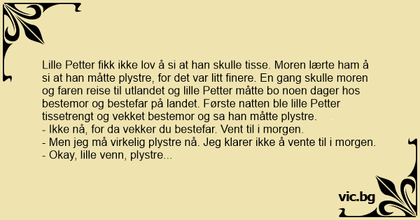 Lille Petter fikk ikke lov å si at han skulle tisse. Moren lærte ham å si at han måtte plystre, for det var litt finere. En gang skulle moren og faren reise til utlandet og lille Petter måtte bo noen dager hos bestemor og bestefar på landet. Første natten ble lille Petter tissetrengt og vekket bestemor og sa han måtte plystre.