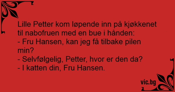 Lille Petter kom løpende inn på kjøkkenet til nabofruen med en bue i hånden: