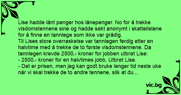 Til Lises store overraskelse var tannlegen ferdig etter en halvtime med å trekke de to første visdomstennene. Da tannlegen krevde 2500,- kroner for jobben utbrøt Lise: