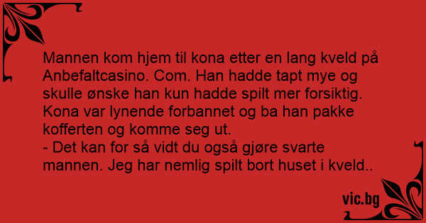 Mannen kom hjem til kona etter en lang kveld på Anbefaltcasino. Com. Han hadde tapt mye og skulle ønske han kun hadde spilt mer forsiktig. Kona var lynende forbannet og ba han pakke kofferten og komme seg ut.