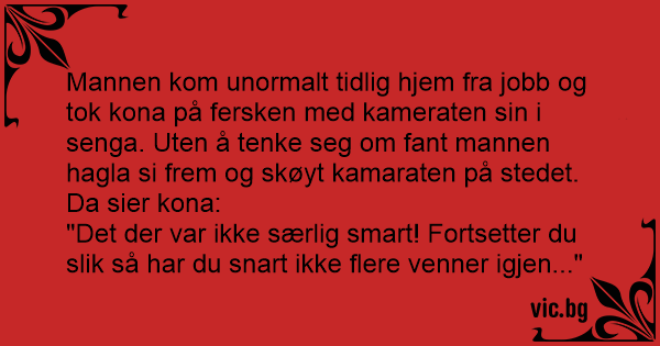 Mannen kom unormalt tidlig hjem fra jobb og tok kona på fersken med kameraten sin i senga. Uten å tenke seg om fant mannen hagla si frem og skøyt kamaraten på stedet.