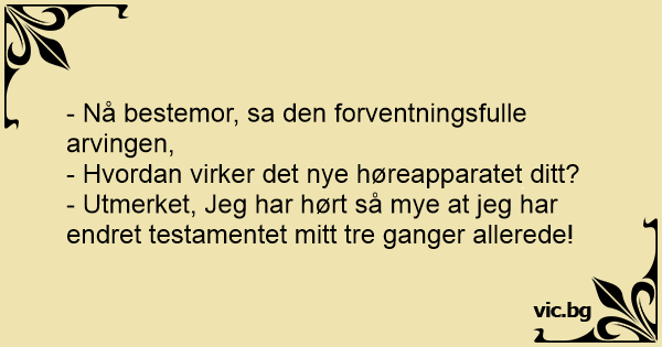 Глух по рождение се подложил на операция по нов, революционен метод и започнал да чува. - So, Mr. Brandberg, are you happy with your new hearing aid? Após testar por uma semana o novo aparelho auditivo, o velho senhor retorna ao médico. Un anziano signore con gravi problemi di udito decide di sottoporsi ad una visita specialistica ed il dottore gli prescrive un apparecchio acustico innovativo in grado di farlo tornare a sentire perfettamente. Доктор към възрастен пациент: - Дядо, как е новият слухов апарат? Оправяш ли се с него? - Докторе,чудесен е!!! Едва втори ден го нося, а вече трети път си сменям завещанието. "Nun Oma, wie funktioniert das neue Hörgerät?" "Sehr gut, ich habe jetzt schon dreimal mein Testament geändert" O médico atende um velhinho milionário que tinha começado a usar um revolucionário aparelho de audição: — E aí, seu Almeida, está gostando do aparelho? — É muito bom. — Sua família gostou? — Ainda... Un viejo muy sordo, pero también muy rico, compra uno de esos novedosos aparatos ultra modernos para oir. Quince días después vuelve muy contento a la tienda donde efectuó su flamante adquisición y... Fragt der Oberarzt seinen Patienten: "Wie sind Sie denn mit Ihrem neuen Hörgerät zufrieden?" "Sehr, ich habe mein Testament schon fünfmal geändert." De dokter schrijft een gehoorapparaat voor aan één van zijn oudere patiënten. De man ziet er echter erg tegenop om het apparaat te dragen, maar omdat hij inziet dat het apparaat nauwelijks... – Nå, Nils, hvordan trives du med det nye høreapparatet? – Det er helt fabelaktig. – Jeg har alt skrevet om testamentet mitt tre ganger. An elderly gentleman had serious hearing problems for a number of years. He went to the doctor and the doctor was able to have him fitted for a set of hearing aids that allowed the gentleman to... Egy idős úr új hallókészüléket kap. Három hét után kérdezi az orvosa: - Na bácsikám, mit szólt a családja az új hallókészülékéhez? - Még nem mondtam el nekik, de azóta már kétszer átírtam a... Egy idős úrnak éveken át komoly hallási nehézségei voltak. Végül orvoshoz fordult, az ellátta őt egy hallókészülékkel, amelynek segítségével ismét 100%-osan hallott. Két hét múlva a férfi... Un anziano signore con gravi problemi di udito da ormai molti anni, va dallo specialista e si fa prescrivere un apparecchio acustico che gli permette di tornare a sentire perfettamente. Dopo un... Albert har köpt en av de nya hörapparaterna och berättar för en vän hur bra den är. - Nå, vad tycker din familj och släkten om den? frågar vännen. - De vet inte att jag har en ny apparat, så jag... En gammel herre havde haft problemer med hørelsen i flere år. Han gik til lægen, og lægen gav ham et høreapparat, så han fik sin hørelse tilbage. En måned efter kom den gamle mand igen op til lægen... Starszy facet miał poważne problemy ze słuchem już od dłuższego czasu. Poszedł więc do lekarza a ten przepisał mu aparat słuchowy, który wrócił choremu słuch w 100 procentach. Po około miesiącu... Und Frau Schmidt, sind Sie zufrieden mit Ihrem neuen Hörgerät? Oh ja, ich musste meine Testament bereits zweimal ändern.