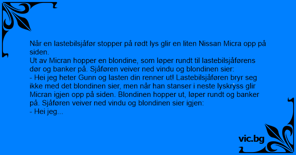- Hei jeg heter Gunn og lasten din renner ut! Lastebilsjåføren rister på hodet og forsetter nedover gaten. Ved det tredje lyskrysset skjer det samme igjen. Atter en gang hopper blondinen ut av Micran, løper rundt og banker på. Sjåføren veiver ned vindu og blondinen sier igjen: