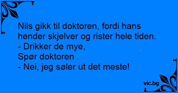 - Докторе, много ми треперят ръцете. Пациент при доктора: Ein Mann, dessen Hände stark zittern, kommt zum Arzt. Man goes to the doctors and sayes "Doctor, I cant stop my hands from shaking !" Doctor replies "Do you drink much ?" Man says "no, I spill most of it !" - Doktorze, czy może mi Pan przepisać coś na ręce? Cały czas się trzęsą. - Czy dużo Pan pije? - Nie. Więcej rozlewam... Lægen En fyr går til lægen, fordi hans hænder ryster hele tiden. “Drikker du meget?” “Nej, jeg spilder det meste.” - Doktor, jeg skjelver sånn på hendene. - Drikker de mye? - Nei, jeg søler ut det meste. Egy pasi bemegy a dokihoz, mert nagyon remeg a keze. - Mondja uram, Ön sokat iszik? - kérdezi a doki. - Hát..., szeretnék, de állandóan kilötyögtetem!