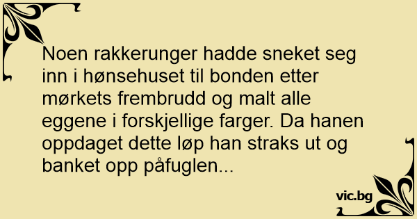Noen rakkerunger hadde sneket seg inn i hønsehuset til bonden etter mørkets frembrudd og malt alle eggene i forskjellige farger. Da hanen oppdaget dette løp han straks ut og banket opp påfuglen...