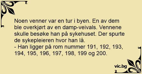 Noen venner var en tur i byen. En av dem ble overkjørt av en damp-veivals. Vennene skulle besøke han på sykehuset. Der spurte de sykepleieren hvor han lå.