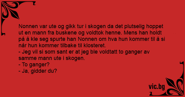 En Nonne Nonnen blev voldtaget af en jæger ude i en skov “Hvad siger du når du kommer tilbage til klosteret?” spurgte jægeren “At jeg blev voldtaget 2 gange” “2 gange?” spurgte jægeren uforstående....