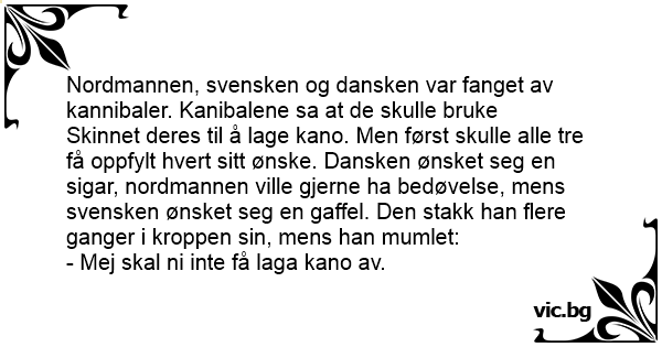 En svensk, en finne och en norrman jobbade på ett oljefartyg. Detta förliste och de tre männen tog sig iland på en ö. Efter en stund Kom ett gäng kannibaler och band dem vid en totempåle. Sedan sa...
