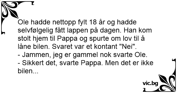 Ole hadde nettopp fylt 18 år og hadde selvfølgelig fått lappen på dagen. Han kom stolt hjem til Pappa og spurte om lov til å låne bilen. Svaret var et kontant "Nei".
