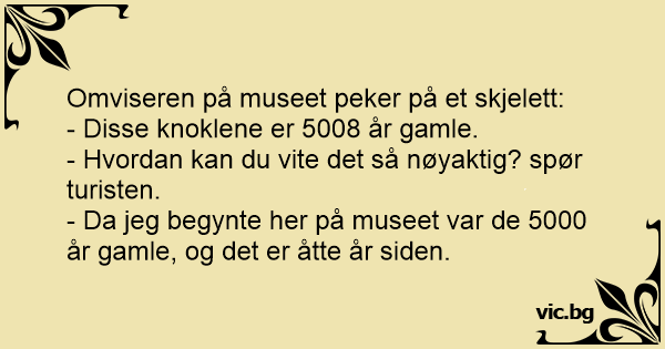En revisor besøgte zoologisk museum. Da han stod ved en af dinosaurerne sagde han til sin sidemand: - Denne dinosaur er 2 millioner og 10 måneder gammel. - Hvor kender du den eksakte dato fra? -...