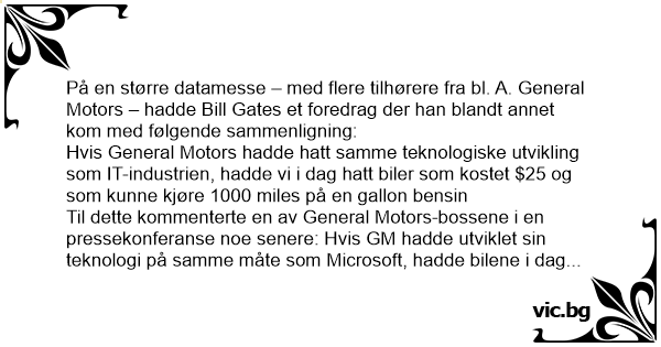 Til dette kommenterte en av General Motors-bossene i en pressekonferanse noe senere: Hvis GM hadde utviklet sin teknologi på samme måte som Microsoft, hadde bilene i dag hatt følgende egenskaper:
