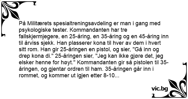 På Militærets spesialtreningsavdeling er man i gang med psykologiske tester. Kommandanten har tre fallskjermjegere, en 25-åring, en 35-åring og en 45-åring inn til årviss sjekk. Han plasserer kona til hver av dem i hvert sitt rom. Han gir 25-åringen en pistol, og sier, "Gå inn og drep kona di." 25-åringen sier, "Jeg kan ikke gjøre det, jeg elsker henne for høyt." Kommandanten gir så pistolen til 35-åringen, og gjentar ordren til ham. 35-åringen går inn i rommet, og kommer ut igjen etter 8-10 minutter, tydelig preget av situasjonen, og sier, "Jeg greier det ikke." Kommandanten gir pistolen til 45-åringen, som går rett inn på rommet hvor kona hans sitter. Døra har ikke før gått igjen, så høres tre skudd i rask rekkefølge, etterfulgt av lyden av knuffing og slåssing. Kommandanten styrter inn i rommet, og ser kona til 45-åringen ligge død på gulvet. Han spør, forferdet; "Hva skjedde?" 45-åringen sier, "En eller annen IDIОТ har ladet pistolen med løskrutt, så jeg var nødt til å knekke nakken hennes."
