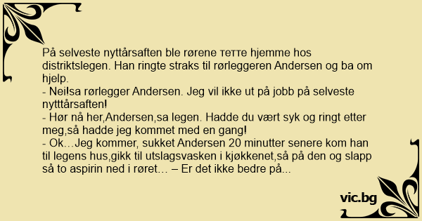 Rohrbruch beim Arzt Отива един водопроводчик при лекаря си на 31 декември: Ein Arzt ruft mitten in der Nacht beim Installateur an, weil er Wasser im Keller hat. Dieser kommt, guckt, wirft ein paar Dichtungsringe ins Wasser und sagt: "Wenn’s morgen nicht besser ist, melden Sie sich nochmal!" Няколко часа до настъпването на Нова година. В дома на лекар се запушва тоалетната. Лекарят звъни на водопроводчик. – Извинете, запуши ми се тоалетната, можете ли да ми помогнете? – Ти луд ли си бе, до Нова година остават два часа! – Ами ние какво? По всяко време, при всякакви метеорологични... Ein Arzt stellt mitten in der Nacht fest, dass sein Keller unter Wasser steht. Sofort ruft er einen Klempner an. Dieser weigert sich allerdings, zu dieser späten Stunde noch zu kommen. Daraufhin... Tohtorin joulu meni pilalle kun viemäri tukkeutui. Hän soitti putkimiehelle ja pyysi tätä apuun. Mutta nythän on jouluaatto, mutisi putkimies. Entä sitten? Jos te sairastutte, minä tulen heti... Lekarz dzwoni w środku nocy do hydraulika, bo woda zalała piwnicę jego willi. Hydraulik przybywa z ociąganiem. Staje na schodach, wrzuca do zalewającej piwnicę wody dwie uszczelki i mówi: - Jeśli... Een huisarts belt in een weekend een loodgieter met de vraag of hij direct wil komen, want hij heeft water in de kelder. De loodgieter probeert de huisarts af te wimpelen en vraagt of dat niet kan... Csőtörés van egy orvos villájában. A doki telefonon hívja az ismerős csőszerelőt. - Azonnal ugorj kocsiba, csőtörés van nálunk, a pincében már minden úszik! - Nem mehetek, tudod hogy ünnepelünk.... Egy orvos az éjszaka közepén felkel és kimegy a vécére. Meglepődve látja, hogy eldugult a toalett. Felébreszti a feleségét: - Drágám, eldugult a vécé, hívjuk ki a vízszerelőt! - Megőrültél? Hajnali... Um medico esta com um vazamento no banheiro que esta preocupando bastante. e obvio, ele só percebe isso quando chega em casa, depois da meia-noite. assim mesmo ele liga para o encanador. o...