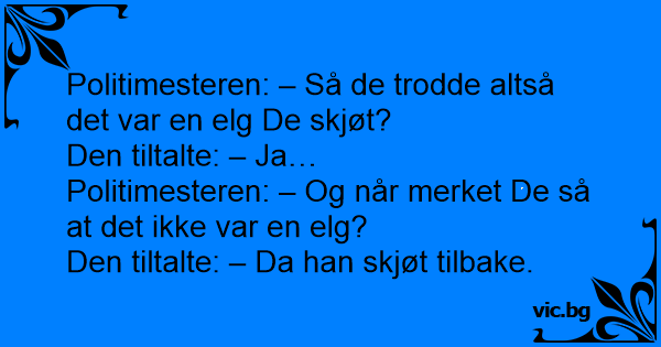 åklagaren till den anklagade: - Ni trodde alltså att det var en älg ni sköt på? - Ja. - Och när upptäckte ni att det inte var en älg? - När han började skjuta tillbaka!