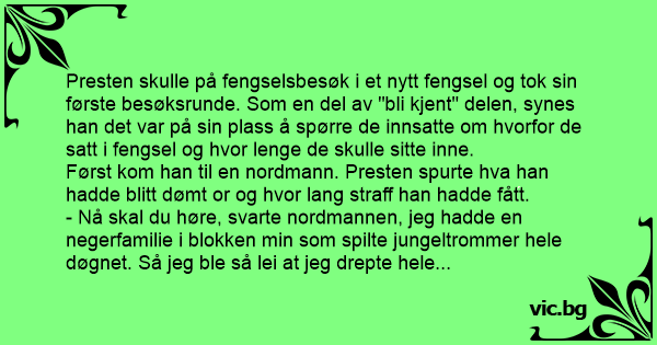 Presten skulle på fengselsbesøk i et nytt fengsel og tok sin første besøksrunde. Som en del av "bli kjent" delen, synes han det var på sin plass å spørre de innsatte om hvorfor de satt i fengsel og hvor lenge de skulle sitte inne.