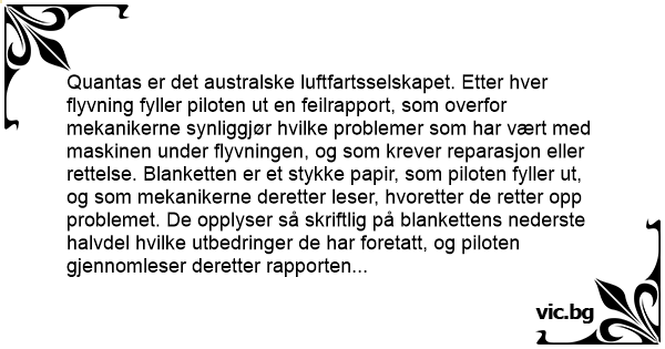 Quantas er det australske luftfartsselskapet. Etter hver flyvning fyller piloten ut en feilrapport, som overfor mekanikerne synliggjør hvilke problemer som har vært med maskinen under flyvningen, og som krever reparasjon eller rettelse. Blanketten er et stykke papir, som piloten fyller ut, og som mekanikerne deretter leser, hvoretter de retter opp problemet. De opplyser så skriftlig på blankettens nederste halvdel hvilke utbedringer de har foretatt, og piloten gjennomleser deretter rapporten før neste flyvning.