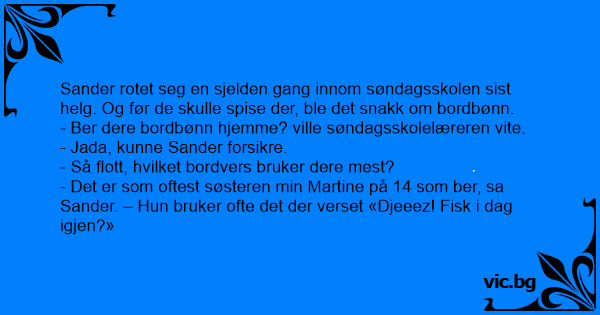 - Det er som oftest søsteren min Martine på 14 som ber, sa Sander. – Нun bruker ofte det der verset «Djeeez! Fisk i dag igjen?»