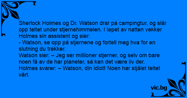 Sherlock Holmes und Dr. Watson wandern Holmes und Watson Σέρλοκ Χολμς Σκηνή Вечер. Σέρλοκ Χολμς και Μάθιου Γουάτσον Двама приятели на излет, с палатка. Шерлок Холмс и доктор Ватсон отправились в поход. Вечером они поставили палатку и улеглись в ней спать. Ночью Холмс будит своего спутника: Sherlock Holmes und Dr. Watson zelten. Mitten in der Nacht wird Dr. Watson von Sherlock Holmes geweckt. Holmes: Sherlock Holmes e il suo fidato assistente Watson vanno in campeggio e dopo una bella cena ed una bottiglia di vino, entrano in tenda e si mettono a dormire. Sherlock Holmes and Dr. Watson went on a camping trip. After a good meal and a bottle of wine, they laid down for the night, and went to sleep. Some hours later, Holmes awoke and nudged his faithful friend. "Watson, look up at the sky and tell me what you see." Watson replied, "I see millions... Two adventurers John and Jack were hunting for gold in the desert. After roaming all day long under the hot sun, they set up their tent and fell asleep. Some hours later, John woke up his friend. "Jack, look up at the sky and tell me what you see." Jack looked up and replied, "I can see... Sherlock Holmes and Doctor Watson are hiking. They hiked all day long and then, having gotten tired, unpacked and quickly retired. Holmes wakes up deep into the night, wakes Watson and says "Watson, do you see the bright stars and do you notice how clear the sky is? What can you deduce from it?"... Sherlock Holmes och doktor Watson campar. De slår upp tältet under stjärnorna och går och lägger sig. Mitt i natten väcker Sherlock Holmes, Watson. - Watson, titta på stjärnorna och berätta vad du... Twee mannen gaan kamperen. Ze zetten de tent op en wanneer de avond valt kruipen ze in hun slaapzak en beginnen te slapen. Om 4u snachts worden ze wakker en de ene vraagt aan de andere : "Weet je... Dos amigos, Luis y Juan se fueron en un viaje de camping. Luego de una buena comida y una botella de vino se despidieron, se acostaron y se fueron a dormir. Algunas horas más tarde, Luis se... Sherlock Holmes och Dr Watson var ute och vandrade i bergen. På kvällen reste de sitt tält under den stjärnbeströdda himlen och gick och lade sig. Någon gång mitt i natten blir Dr Watson väkt av... Sherlock Holmes et le Dr Watson sont au camping. Après un bon repas et une bouteille de vin, ils gagnent leur sac de couchage dans leur tente et s'endorment. Quelques heures plus tard, Holmes se... Sherlock Holmes e o doutor Watson vão acampar. Após um bom jantar e uma garrafa de vinho, entram nos sacos de dormir e caem no sono. Algumas horas depois, Holmes acorda e sacode o amigo e diz: —... Dwaj koledzy nocują pod namiotem. W środku nocy jeden budzi drugiego: - Co widzisz? - Gwiazdy i księżyc. - Co to oznacza? - Że jutro będzie ładna pogoda. - Ty głupku! To oznacza, że ukradli nam... Sherlock Holmes og Dr. Watson var på telttur. En kveld lå de og tittet opp på himmelen. Holmes sa: - Watson, hva ser du? - Vel, jeg ser tusener av stjerner. - Og hva betyr det for deg? - Det betyr... Sherlock Holmes wybrał się z Dr Watsonem do lasu. W pewnym momencie w nocy, Holmes budzi Watsona i pyta: - Drogi Watsonie, czy śpisz? - Nie... - A co widzisz nad sobą, drogi Watsonie? - Widzę... Gittikleri yerde kamp kurarlar. Tatillerinin ikinci gününün akşamı güzel bir yemek yiyip uykuya dalarlar. Birkaç saat sonra kadın uyanır ve kocasını da uyandırır. Adam uyku sersemidir; güzel bir... Sherlock Holmes En berømte detektiv Sherlock Holmes og hans assistent Doctor Watson er på camping og overnatter i telt. Midt om natten prikker Holmes til Watson og spørger ham: “Watson, kig op på... Sherlock Holmes és dr. Watson túrázni mennek, felállítják a sátrukat, és elalszanak. Néhány óra múlva Holmes felébreszti hűséges társát: - Watson, nézzen fel az égre és mondja meg, mit lát! -... Sherlock Holmes en zij assistent dr. Watson zitten op een camping. Zegt Sherlock ineens: "Kijk eens naar boven en zeg me wat ziet. Redeneer, formuleer en concludeer!" . Dus dr. Watson kijkt omhoog... Holmes ed il Dott. Watson decidono di passare un week end in campeggio in una tenda nel mezzo di una foresta. A notte fonda Holmes sveglia il dottore: "Watson, nota niente di strano?? guardi in... Sherlock Holmes a doktor Watson si vyjeli do přírody. Večer unaveni ulehli do stanu. Holmes se v noci probudil, šťouchl do Watsona a když se vzbudil, povídá: „Drahý Watsone, vidíte ty jasné hvězdy?... Sherlock Holmes e o Dr Watson estão acampados em plena selva. Holmes acorda no meio da noite, agitado. — WATSON! - grita ele. O bom e prestativo Watson desperta, assustado. — O que foi Holmes? —... Sherlock Holmes e il dottor Watson si trovano in vacanza in un campeggio. Dopo una buona cena e un'ottima bottiglia di vino, si ritirano in tenda e si addormentano profondamente. Durante la notte... Sherlock Holmes och Watson är på tältsemester. De sätter upp tältet under en stjärnklar himmel och går och lägger sig. Mitt i natten blir Watson väckt av Sherlock Holmes. - Watson, titta på... Sherlock Holmes og Watson var på telttur. De ligger i soveposerne og Holmes siger: - Watson, ved du hvad stjernerne får mig til at tænke på? Watson bryder ud i en flere minutter lang... Sherlock Holmes och Watson campade på engelska landsbygden och avnjöt en god måltid och delade på en flaska vin innan de lade sig för att sova. Några timmar senare vaknade Holmes och ruskade sin... Sherlock Holmes and Dr. Watson went on a camping trip. As they lay down for the night, Holmes said: - ” Watson, look up into the sky and tell me what you see?" Watson said, "I see millions and... Sherlock Holmes és dr. Watson kempingeznek. Éjjel Sherlock felébred, és megböki Watsont. - Mi