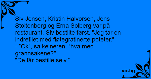 Siv Jensen, Kristin Halvorsen, Jens Stoltenberg og Erna Solberg var på restaurant. Siv bestilte først. ”Jeg tar en indrefilet med fløtegratinerte poteter.”