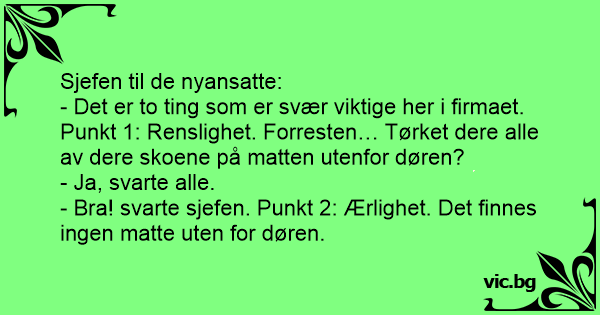 - Det er to ting som er svær viktige her i firmaet. Punkt 1: Renslighet. Forresten… Tørket dere alle av dere skoene på matten utenfor døren?