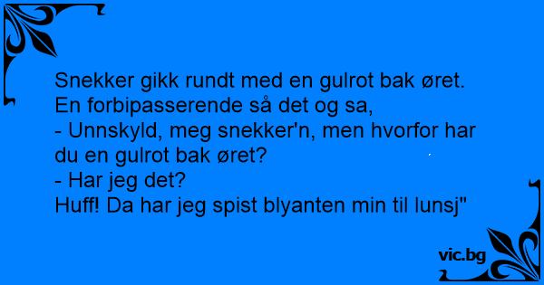 - Unnskyld, meg snekker'n, men hvorfor har du en gulrot bak øret?