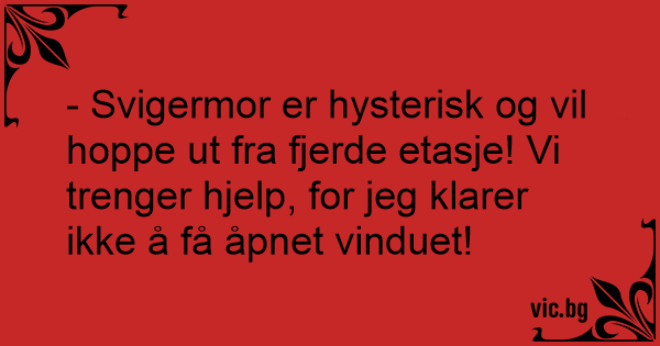 - Svigermor er hysterisk og vil hoppe ut fra fjerde etasje! Vi trenger hjelp, for jeg klarer ikke å få åpnet vinduet!