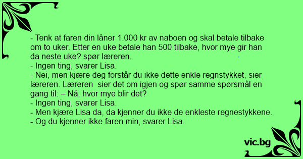 - Nei, men kjære deg forstår du ikke dette enkle regnstykket, sier læreren. Læreren sier det om igjen og spør samme spørsmål en gang til: – Nå, hvor mye blir det?