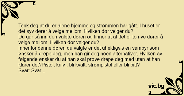 Innenfor denne døren du valgte er det uheldigvis en vampyr som ønsker å drepe deg, men han gir deg noen alternativer. Hvilken av følgende ønsker du at han skal prøve drepe deg med uten at han klarer det?Pistol, kniv , bli kvalt, strømpistol eller bli bitt?