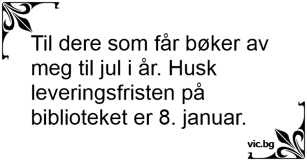 Til dere som får bøker av meg til jul i år. Husk leveringsfristen på biblioteket er 8. januar.