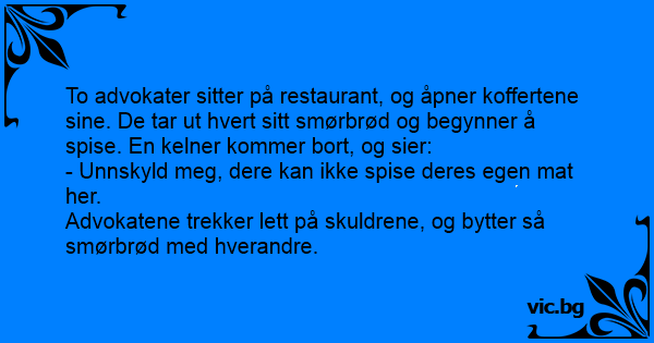 Двама юристи, влизат в едно кафене, извадили домашно приготвени сандвичи и почнали да ги ядат. Дотичала сервитьорката: Два юриста в кафе достали бутеры. Two attorneys went into a diner and ordered two drinks. Then they produced sandwiches from their briefcases and started to eat. The owner became quite concerned and marched over and told them, Two lawyers arrive at the pub and ordered a couple of drinks. They then take sandwiches from their briefcases and began to eat. Seeing this, the angry publican approaches them and says, 'Excuse me,... Zwei Anwälte kommen in ein Restaurant und bestellen je einen Drink. Als sie versorgt sind, packen sie jeder ein Sandwich aus dem Koffer und beginnen zu essen. Es dauert nicht lange, da kommt der... Dwóch prawników weszło do baru. Zamówili po drinku, po czym wyciągnęli z teczek po kanapce i zaczęli jeść. Natychmiast pojawił się przed nimi właściciel baru. - Panowie, bez przesady... Nie możecie... I middagspausen smuttede to advokater ind på bistroen over for domhuset. De satte sig til rette på terrassen og bestilte drikkevarer, hvorefter de hver især trak en sandwich frem fra deres... Kaksi asianajajaa meni päivälliselle ja tilasi kaksi olutta. Voileivät nostettiin salkuista ja eväs alkoi. Baarimikko marssi pöytään. - Ette te voi syödä omia leipiänne täällä! Asianajajat... Két ügyvéd bemegy egy étterembe, leülnek, kérnek egy pohár vizet, majd kinyitják az aktatáskájukat és elővesznek 1-1 szendvicset. A pincér felháborodva odaszól: - De uraim! Ez egy étterem! Itt nem... Tarjoilija blondeille: - Anteeksi, mutta ravintolassamme ei saa syödä omia eväitä. Blondit katsoivat toisiaan hetken ja vaihtoivat eväänsä