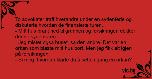 - Mitt hus brant ned til grunnen og forsikringen dekker denne sydenturen.