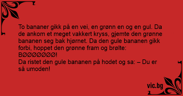 To bananer gikk på en vei, en grønn en og en gul. Da de ankom et meget vakkert kryss, gjemte den grønne bananen seg bak hjørnet. Da den gule bananen gikk forbi, hoppet den grønne fram og brølte:
