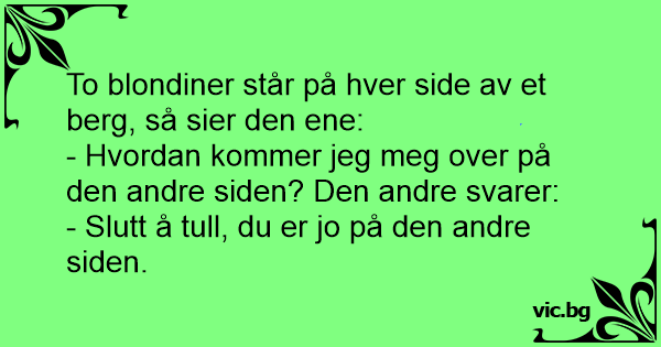 Op 2 onbewoode eilanden in de stille zuidzee met op elk een blondje.Zegt de een: "Hoe kom ik aan de overkant?" Zegt de ander: "Je staat er al!"