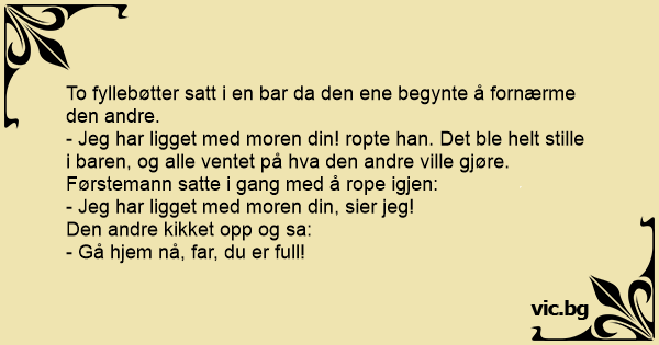 - Jeg har ligget med moren din! ropte han. Det ble helt stille i baren, og alle ventet på hva den andre ville gjøre.