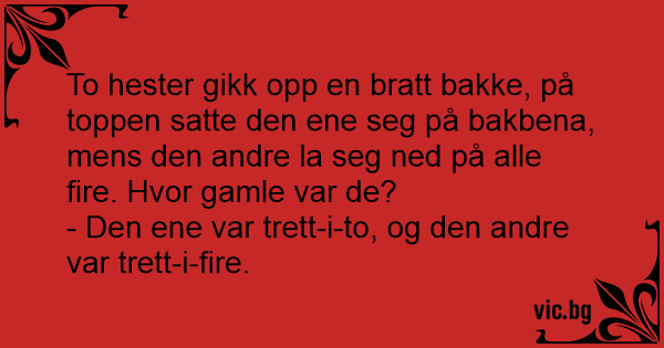 To hester gikk opp en bratt bakke, på toppen satte den ene seg på bakbena, mens den andre la seg ned på alle fire. Hvor gamle var de?