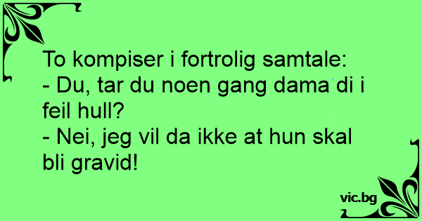 Patient til patient Den ene patient til den anden: “Tager du nogensinde din kone i det forkerte hul?” “Nej da, hun skulle jo nødig blive gravid”