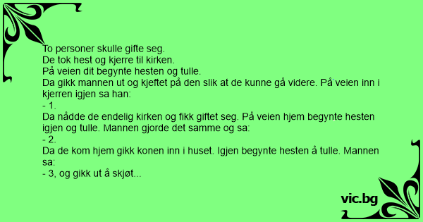 Da nådde de endelig kirken og fikk giftet seg. På veien hjem begynte hesten igjen og tulle. Mannen gjorde det samme og sa: