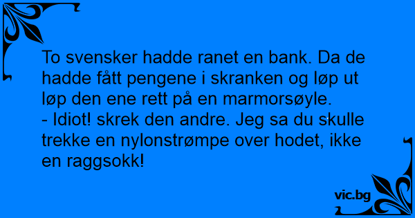 - Idiот! skrek den andre. Jeg sa du skulle trekke en nylonstrømpe over hodet, ikke en raggsokk!