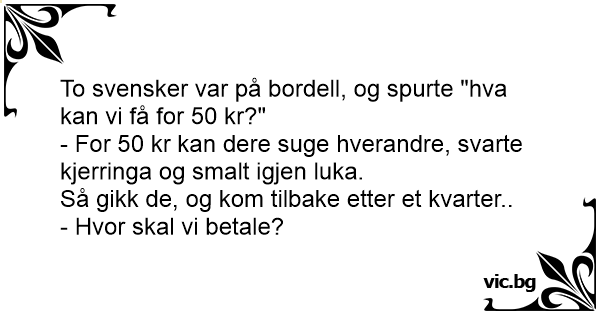 Två personer står utanför ett horhus. De bankar på dörren, Madame öppnar. - Vad ville ni? - Vi ville komma in, säger personerna. - Hur mycket pengar har ni? - Vi har tillsammans 250 kr. - För 250...