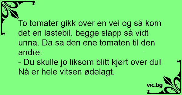 To tomater gikk over en vei og så kom det en lastebil, begge slapp så vidt unna. Da sa den ene tomaten til den andre: