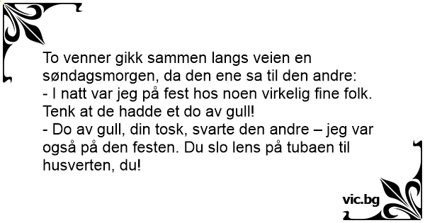 - Do av gull, din tosk, svarte den andre – jeg var også på den festen. Du slo lens på tubaen til husverten, du!