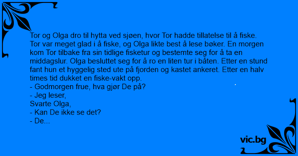 Tor og Olga dro til hytta ved sjøen, hvor Tor hadde tillatelse til å fiske. Tor var meget glad i å fiske, og Olga likte best å lese bøker. En morgen kom Tor tilbake fra sin tidlige fisketur og bestemte seg for å ta en middagslur. Olga besluttet seg for å ro en liten tur i båten. Etter en stund fant hun et hyggelig sted ute på fjorden og kastet ankeret. Etter en halv times tid dukket en fiske-vakt opp.